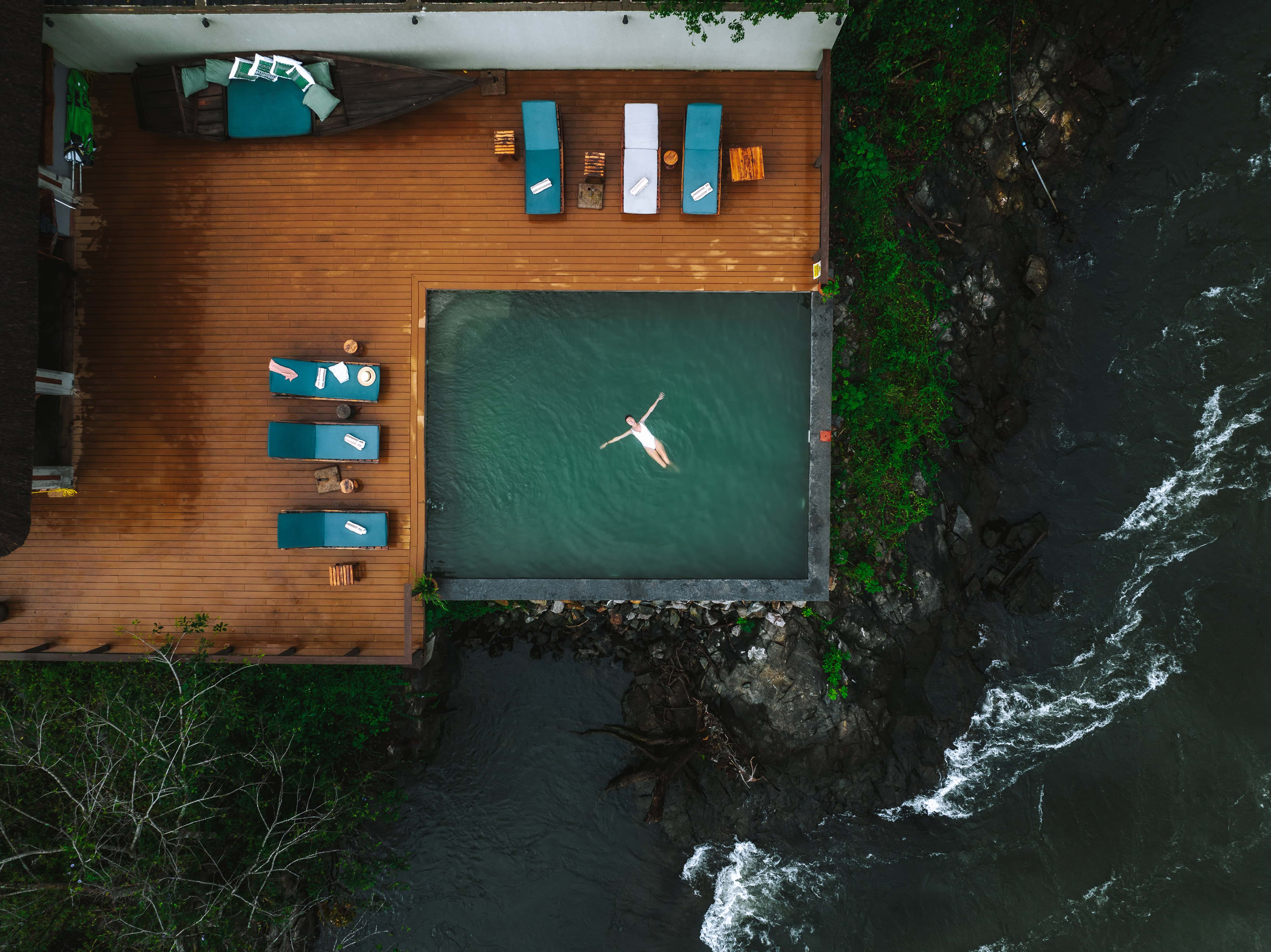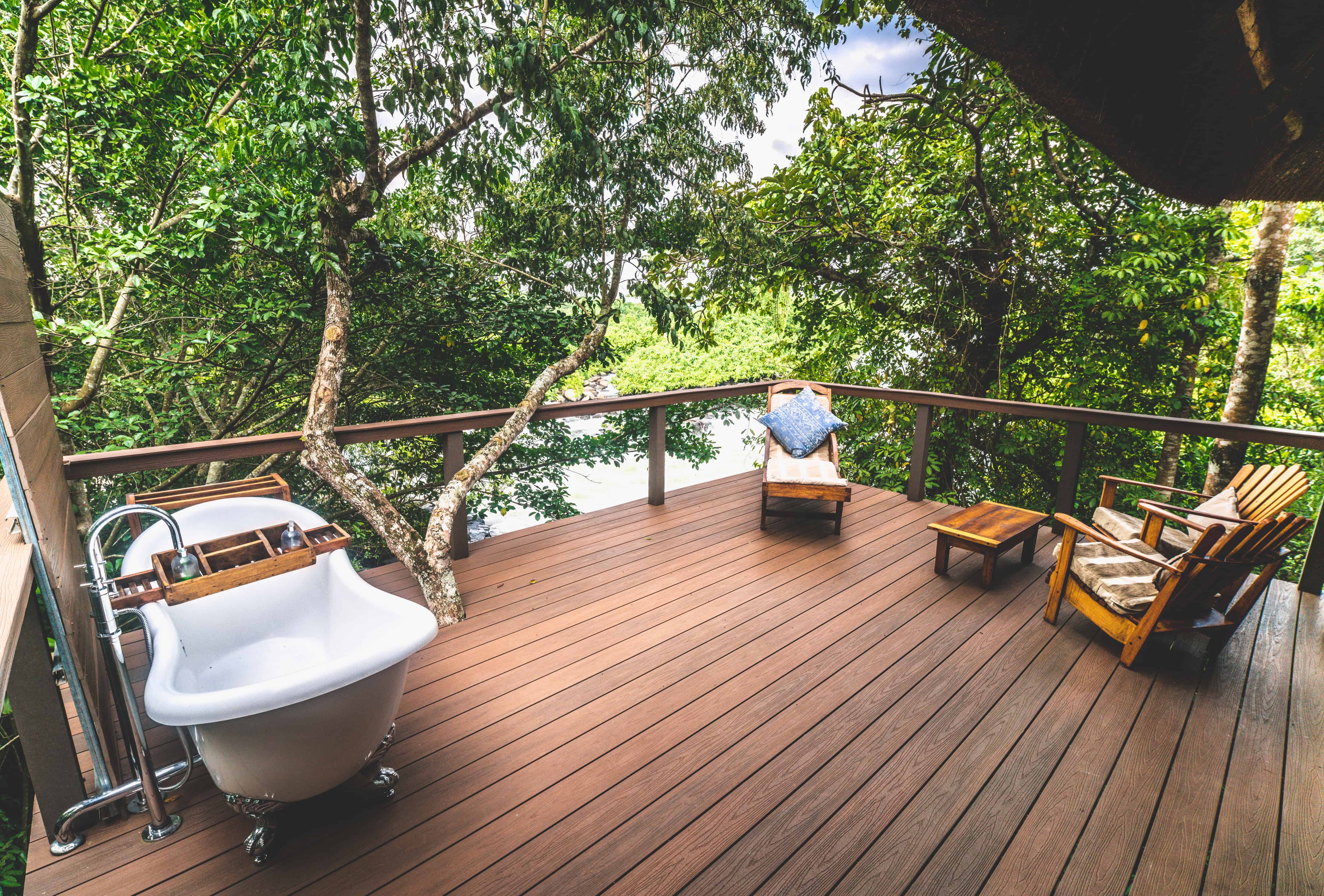 Accommodation is limited to a handful of elegantly appointed suites, each perched on stilts and outfitted with claw-foot bathtubs, open-air showers, and sweeping views of the rushing river. Wooden walkways connect the rooms to a central lounge and restaurant area, all designed to harmonize with the surrounding environment. The river’s soundtrack is ever-present—a deep, continuous rumble that underscores the lodge’s untamed charm.