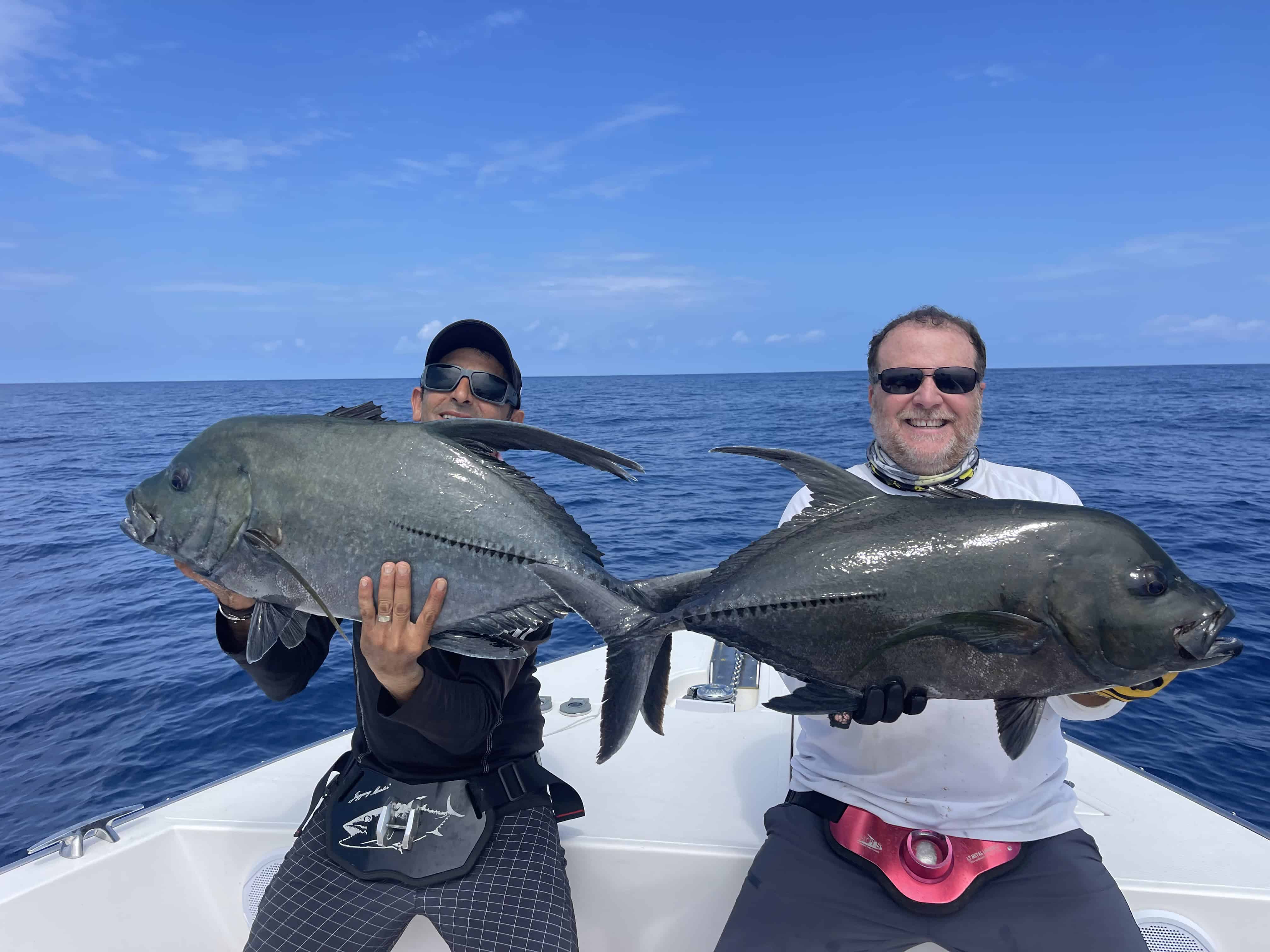Three consecutive full days of inshore or offshore fishing, departing from Baie Sainte Anne marina. Target species include dogtooth tuna, yellowfin tuna, giant trevally, wahoo, and reef species using jigging and popping techniques. Daily runs are adjusted based on conditions and fish activity.